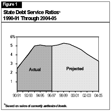 The level of debt payments expressed as a percentage of state General Fund revenues is referred to as the state's ''debt ratio." Figure 1 shows actual and projected debt ratios from 1990-91 through 2004-05. The figure shows that as currently authorized bonds are sold, the state's debt ratio will increase to 5.3 percent in 1998-99 and decline thereafter.